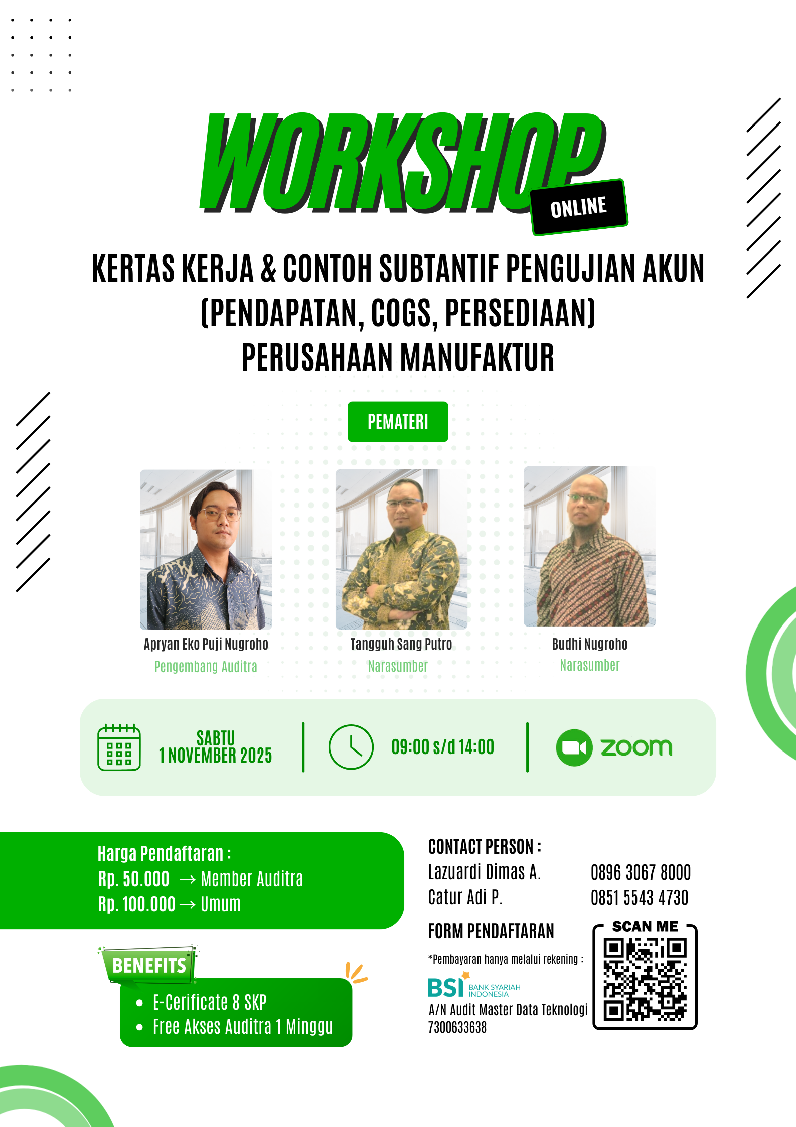 Workshop ini akan memberikan wawasan praktis yang dapat langsung diterapkan dalam pekerjaan audit, terutama dalam konteks perusahaan manufaktur.